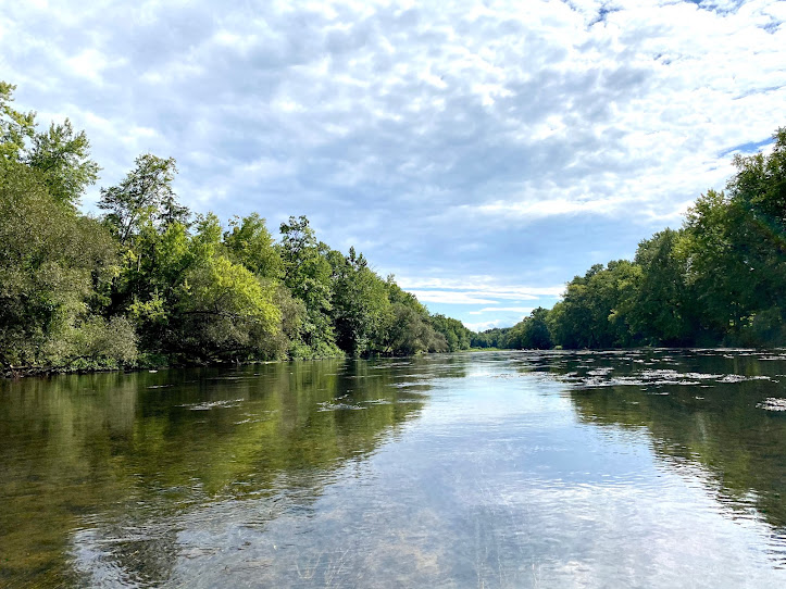You pass the bridge and traipse down a grassy hill that she’d rather roll down. Last time, she went too fast and ended up rolling onto the gravel beyond. You tell her you need her help carrying the gear. She obliges and makes it to your special spot on the riverbank free of grass stains and scrapes.